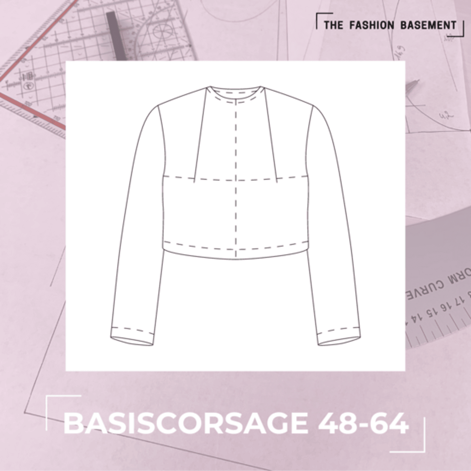 Een basispatroon is de meest eenvoudige versie van een kledingstuk. Het basiscorsage is een bovenkledingstuk van hoog in de hals, aansluitend over de borst, recht naar beneden tot op de taille en met een lange rechte mouw. Met dit basispatroon kan je eindeloos variëren en alle blouses en tops maken die een normaal aansluitende pasvorm hebben. (dus geen oversized blouse) Dit corsage bevat zowel borstneep als schouderbladneep om een mooi passende vorm te bekomen. Ons basispatroon bevat voor elke kledingmaat 9 cupmaten waardoor je zeker een maat zal vinden die goed voor je past.