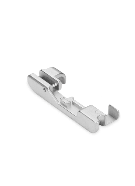 De groef van de geleider geleidt de bies terwijl deze wordt gevouwen en ingenaaid. De open geleider helpt bij het aannaaien van kralen, parels en lovers op draad.