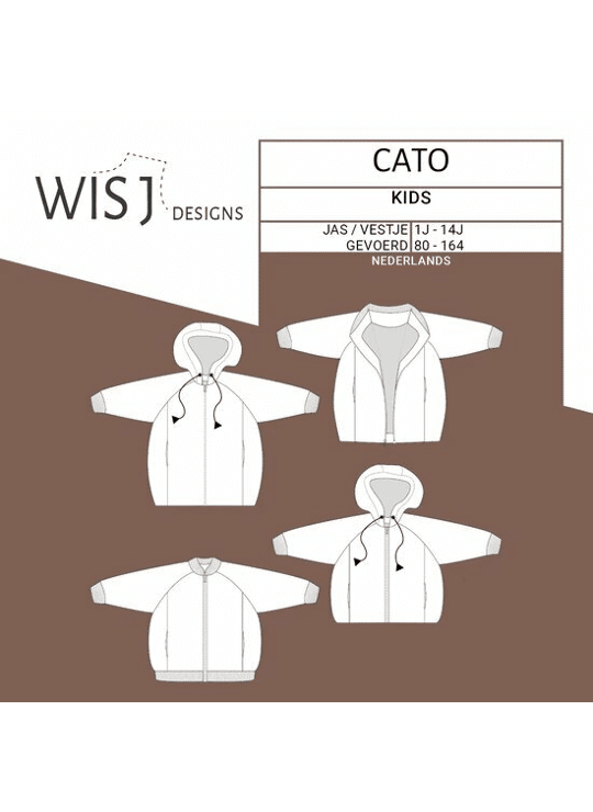 Cato is een veelzijdig papieren patroon voor een jasje met raglanmouwen en zakken weggewerkt in het voorpand. Maak de lange versie voor een deftiger manteltje of maak net een stoer bomberjasje met boorden. Kies voor een eenvoudige voering of ga voor een nettere afwerking met beleg en voering. Kies voor een kap (met of zonder touwtje erdoor) bij je stoere bombervest of als je een regenjasje wil maken. Of kies voor een simpele halsboord. Je maakt Cato zo ingewikkeld of zo eenvoudig als je zelf wil: je naait er een heuse jas van of je houdt het op een eenvoudig bombervestje.