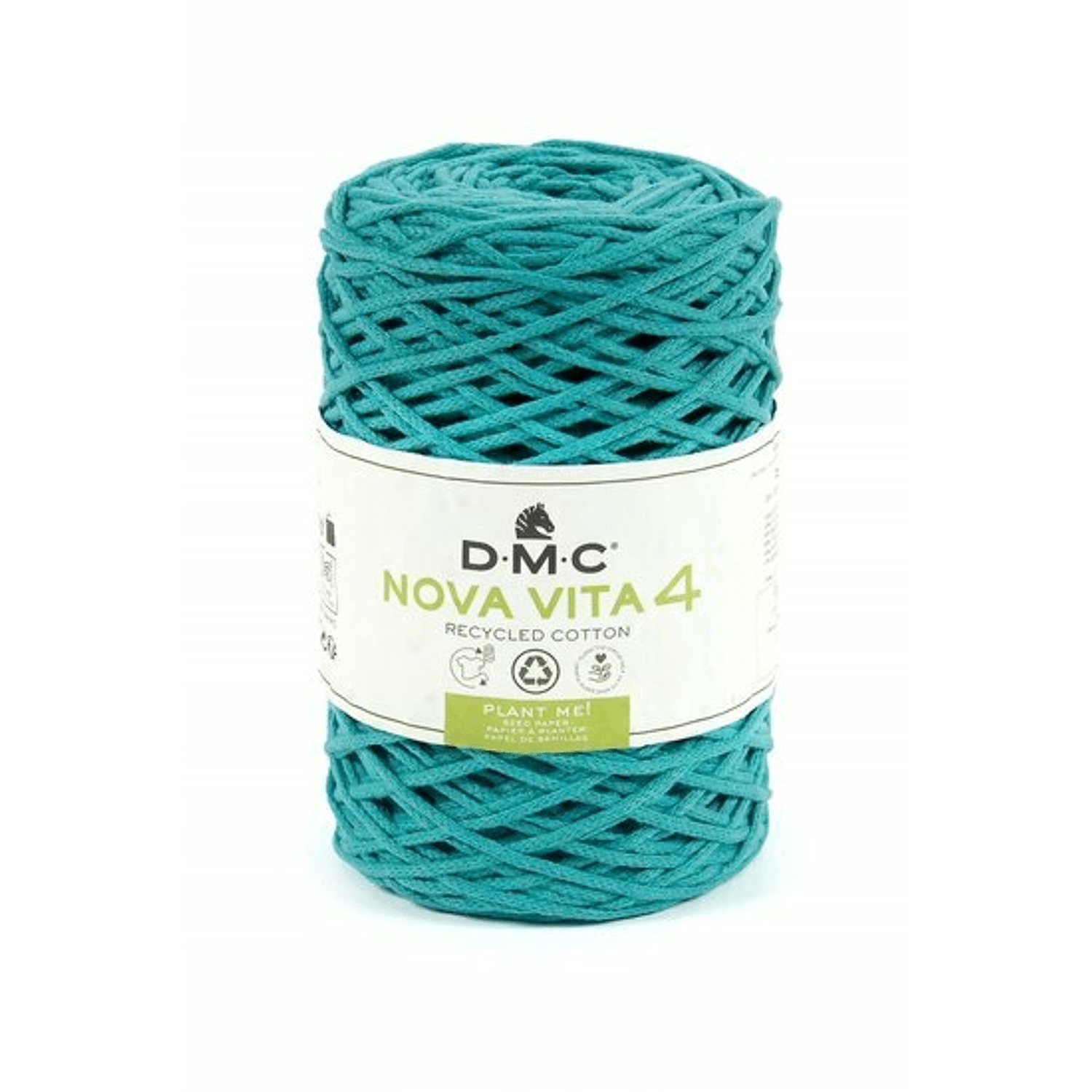 Het garen Nova Vita 4 van DMC wordt gemaakt van textielafval dat gemalen, geverfd en opnieuw wordt gesponnen. Als je de wikkel (zaadpapier) in de grond steekt in plaats van die weg te gooien dan zullen er plantjes groeien. Het koordgaren heeft een doorsnee van 4 mm en bestaat uit een geweven omhulsel rond een dunnere draad die het zijn stevigheid geeft. Het is bij uitstek geschikt voor het haken, breien of macrameeën van woon- en modeaccessoires, zoals tassen, placemats, kussens, lampenkappen of plantenhangers. Nova Vita 4 is samengesteld uit 80% gerecycled katoen en 20% polyester en heeft het OEKO-TEX® Standard 100 keurmerk. Wasbaar tot 30 graden. De aanbevolen naalddikte voor breien is 5.00mm en voor haken 4.00mm. Een bol Nova Vita 4 weegt 250 gram en heeft een looplengte van 200 meter.