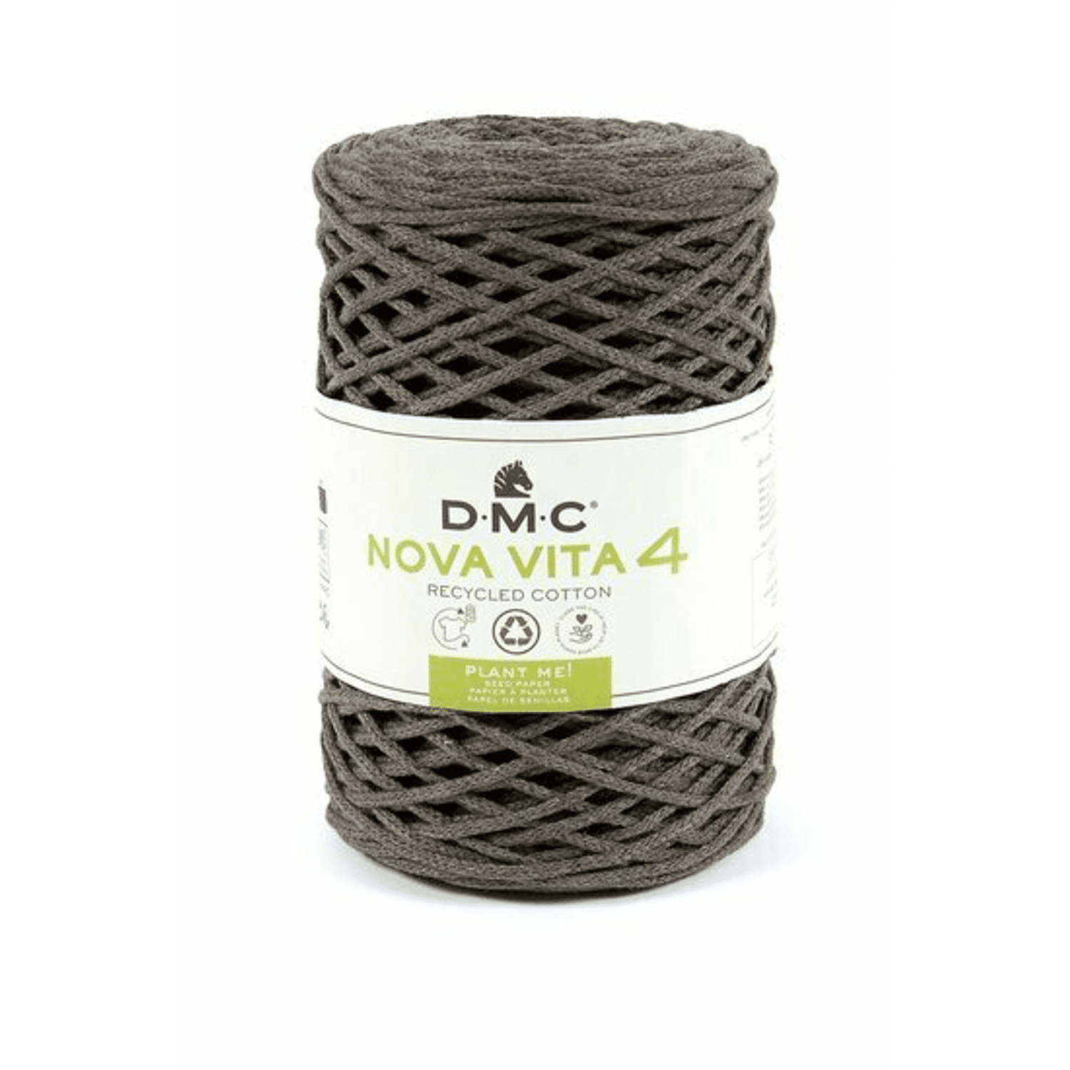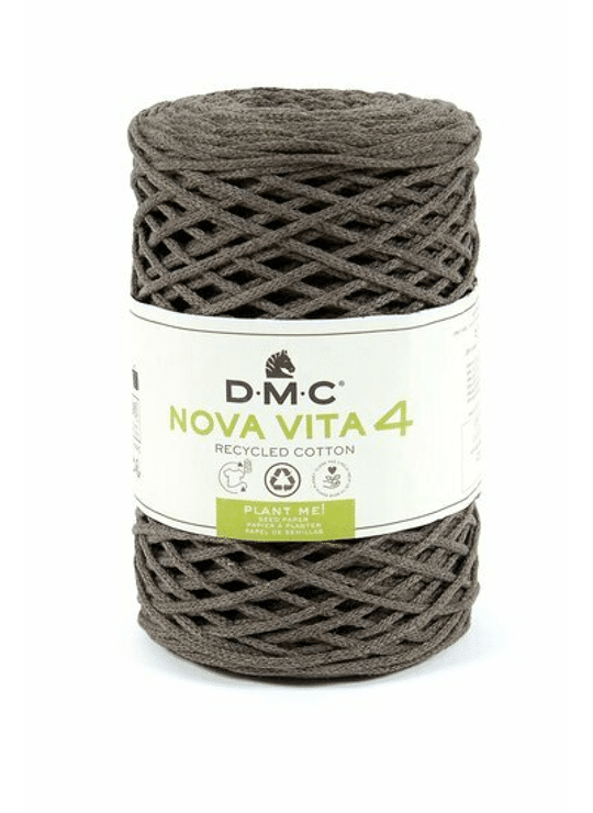 Het garen Nova Vita 4 van DMC wordt gemaakt van textielafval dat gemalen, geverfd en opnieuw wordt gesponnen. Als je de wikkel (zaadpapier) in de grond steekt in plaats van die weg te gooien dan zullen er plantjes groeien. Het koordgaren heeft een doorsnee van 4 mm en bestaat uit een geweven omhulsel rond een dunnere draad die het zijn stevigheid geeft. Het is bij uitstek geschikt voor het haken, breien of macrameeën van woon- en modeaccessoires, zoals tassen, placemats, kussens, lampenkappen of plantenhangers. Nova Vita 4 is samengesteld uit 80% gerecycled katoen en 20% polyester en heeft het OEKO-TEX® Standard 100 keurmerk. Wasbaar tot 30 graden. De aanbevolen naalddikte voor breien is 5.00mm en voor haken 4.00mm. Een bol Nova Vita 4 weegt 250 gram en heeft een looplengte van 200 meter.