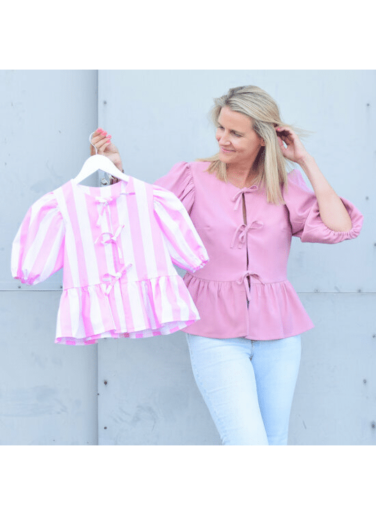 Evie is een speelse blouse met peplum die sluit met lintjes vooraan.