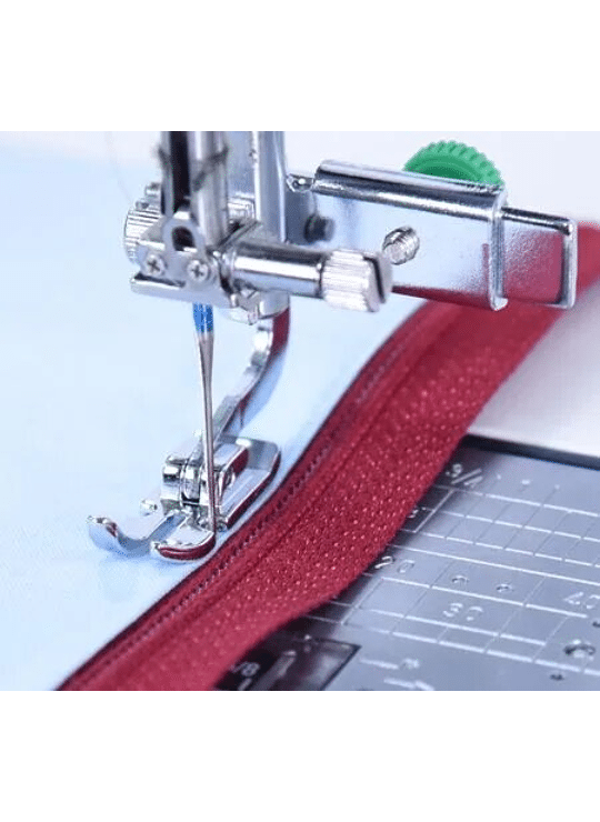 Deze voet kan worden ingesteld om aan elke kant van de rits te naaien. De rand van de voet geleidt de ritssluiting om een rechte plaatsing te garanderen.