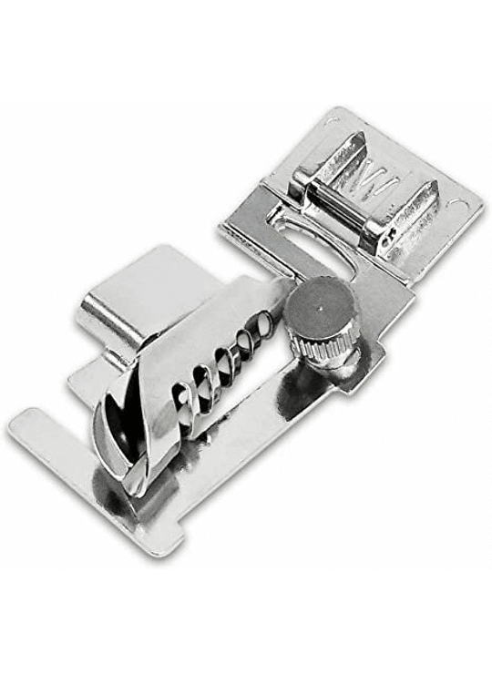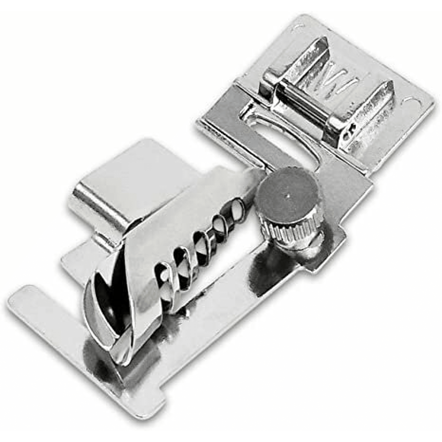 Deze voet wordt gebruikt om voorgevouwen biais te begeleiden en vast te stikken in 1 handeling. Het is ook mogelijk om zelf een strookje stof te knippen en dankzij deze voet wordt die automatisch geplooid en vastgestikt. Gebruik een rechte of zigzagsteek (of decoratieve steek). De biaisband mag tussen de 10 en 14 mm breed zijn.