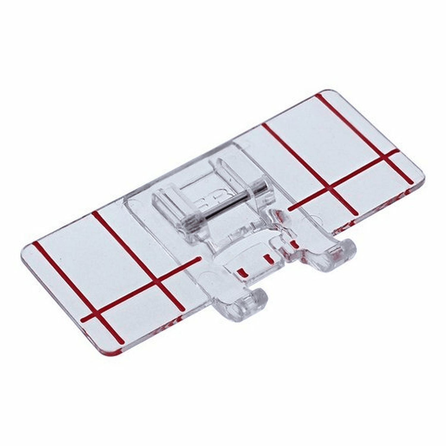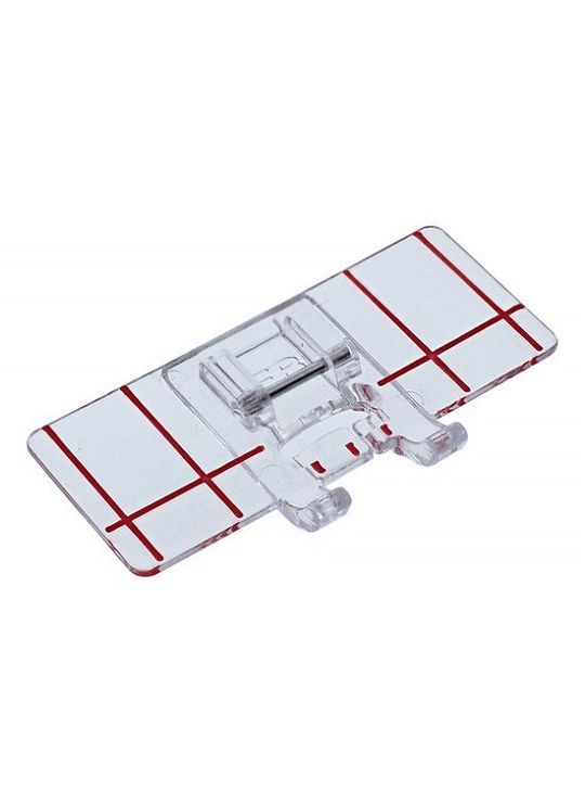 Heeft u problemen met het uitlijnen of gelijkmatig verdelen van uw decoratieve steken? De randgeleidervoet helpt u om uw randmotieven gemakkelijk te volgen dankzij de rode lijnen op de voet. Het is niet nodig om elke rij van tevoren te markeren. De twee sets verticale rode lijnen zijn gekalibreerd om een perfecte afstand tussen rijen mogelijk te maken. De horizontale rode lijn komt overeen met de naaldpositie, zodat u het begin van elke rij kunt uitlijnen. De kleine rode markering geeft het midden van het motief aan om in lijn te zijn met de markering voor de eerste rij.