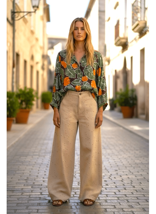 - Katoen - Leaves with Orange Flowers - Bruin