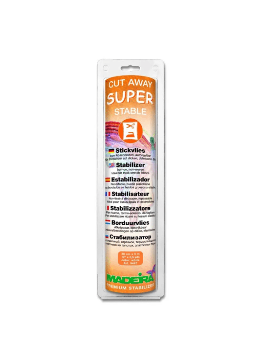 Madeira Cut Away Super Stable is een afknipbaar, opstrijkbaar borduurvlies. Het geeft dikke, elastische stoffen de nodige stabilisatie om zonder te verschuiven machinaal geborduurd te kunnen worden. Door het opstrijken wordt de stof vastgezet en kan samen met Cotton Stable (stik-en-trek borduurvlies) glijvast bestikt worden. Ideaal voor stabiliseren van borduurwerk op dikke elastische stoffen, borduurpatronen met groot aantal steken en hoge steekdichtheid. Het kan ook worden gebruikt om stoffen te stabiliseren voor het naaien van tassen, patchwork en vele andere creatieve projecten.