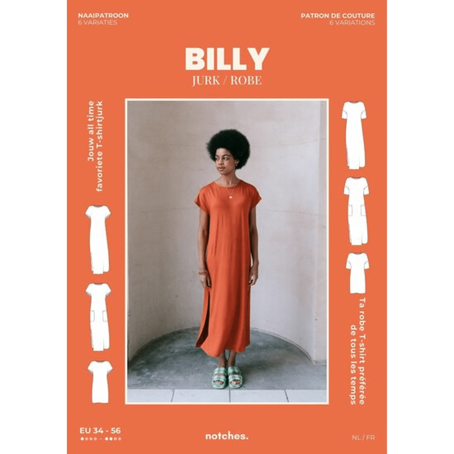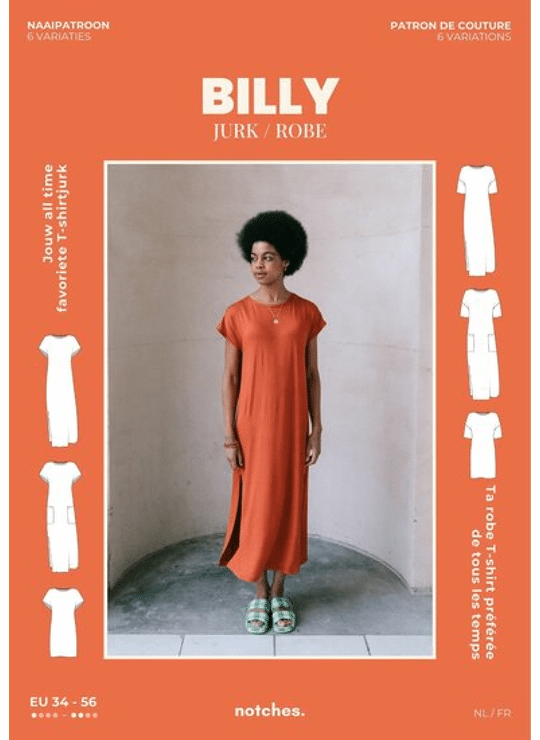 Billy is een rechttoe rechtaan T-shirtjurk in een korte of lange lengte. Met dropped shoulder en keuze uit een rechte mouw of mouwloos met boordje. Optioneel met opgestikte zakken. De wijde, rechte snit past veel figuurtypes (geen borstneep). De lange versie heeft zijsplitten voor extra bewegingsruimte.