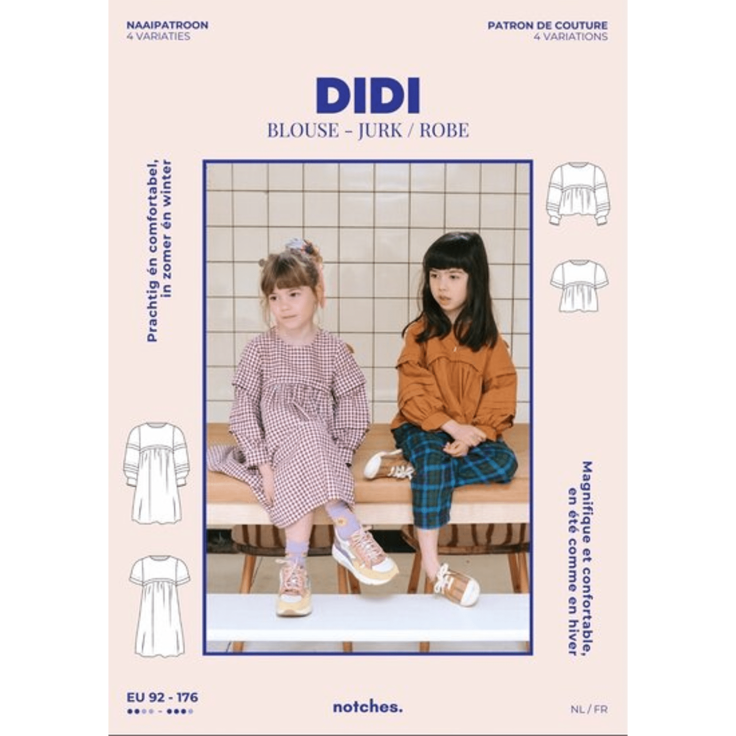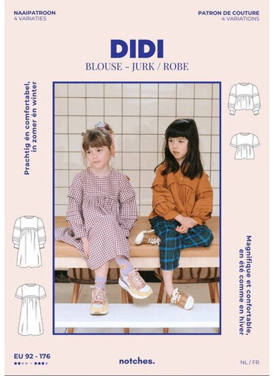 Didi zit boordevol leuke technieken: rugsplit met knoopsluiting, rimpels met overlappend boordje en opvallende sierplooien aan de mouwen. Kies voor een lange lampionmouw met sierplooien of een korte mouw met één sierplooi. Maak een blouse of jurk: perfect voor elk seizoen.