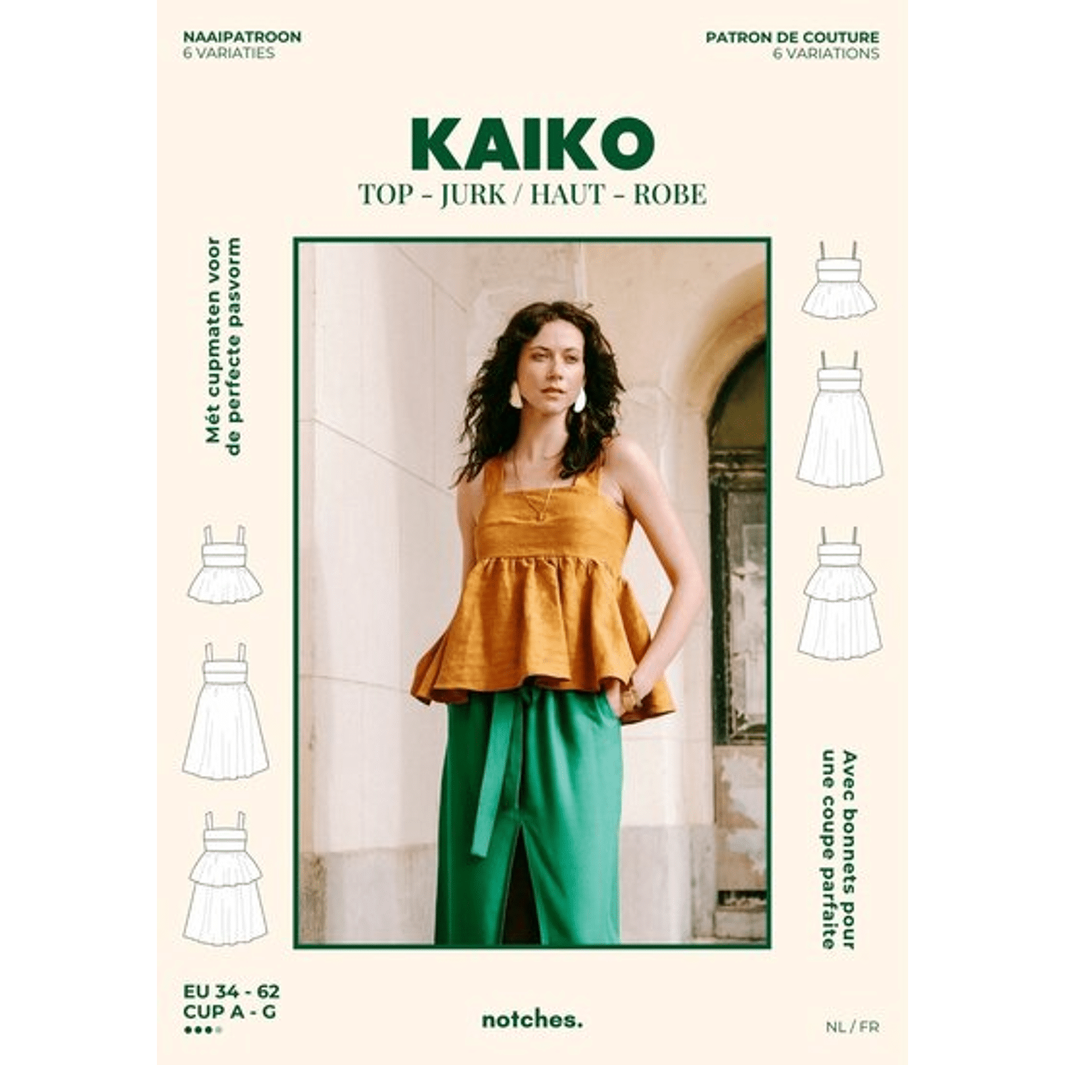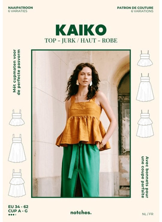 Van peplum top tot zomerse jurk: Kaiko is een veelzijdig patroon dat je ook hip over een T-shirt draagt. Kies voor een korte top of een jurk net boven de knie. Het rokdeel waaiert wijd uit; combineer beide rokdelen voor een zwierige laagjesjurk. Met knopensluiting op de rug en keuze uit brede gevormde bandjes of smalle linten. Het gevoerde borststuk is er in meerdere cupmaten en het patroon gaat tot maat 62.