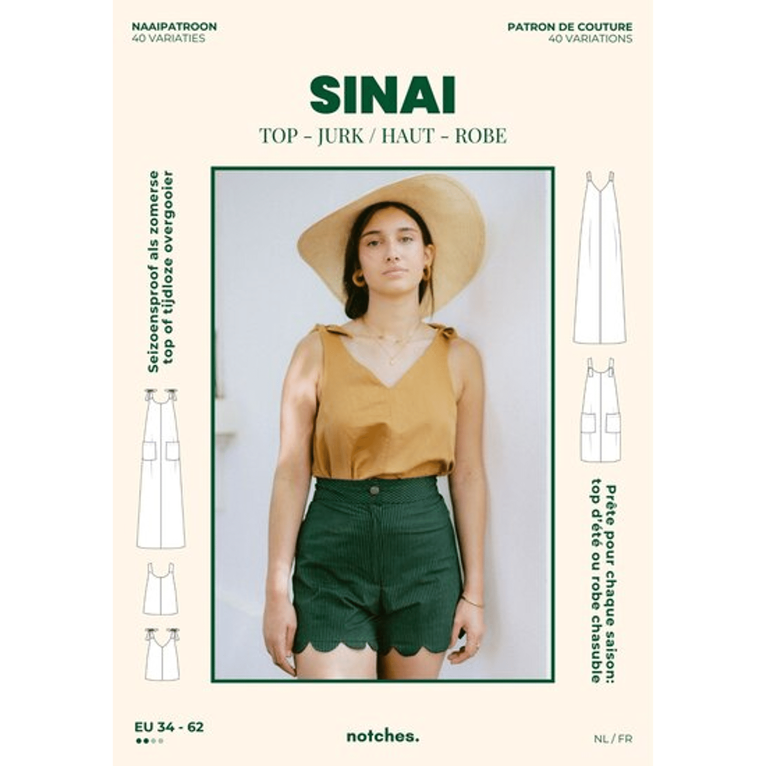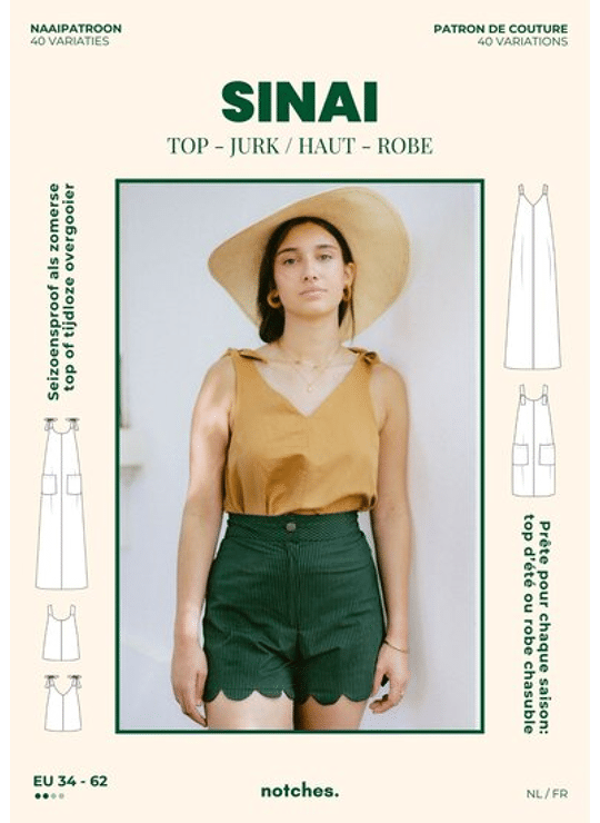 Sinai is een luchtige A-lijn top of jurk met losse pasvorm, diepe ronde rug en veel variaties. Kies ronde hals of V-hals en werk de bandjes af met lintjes, knoopjes, elastiek of netjes ingewerkt. Met 3 lengtes (top, korte jurk, maxi) en optionele zijsplitten maak je makkelijk meerdere looks: zomers, als laagje of als overgooier.