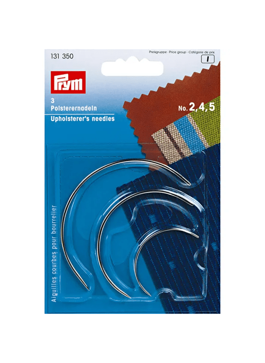 De Prym Gebogen Stoffeerdersnaalden zijn stevige handnaalden met een gebogen vorm, ideaal voor stoffeerwerk en moeilijk bereikbare plaatsen. Dankzij de kromming naai je eenvoudig door dikke materialen en werk je comfortabel aan bekleding, matrassen en meubelstoffen.