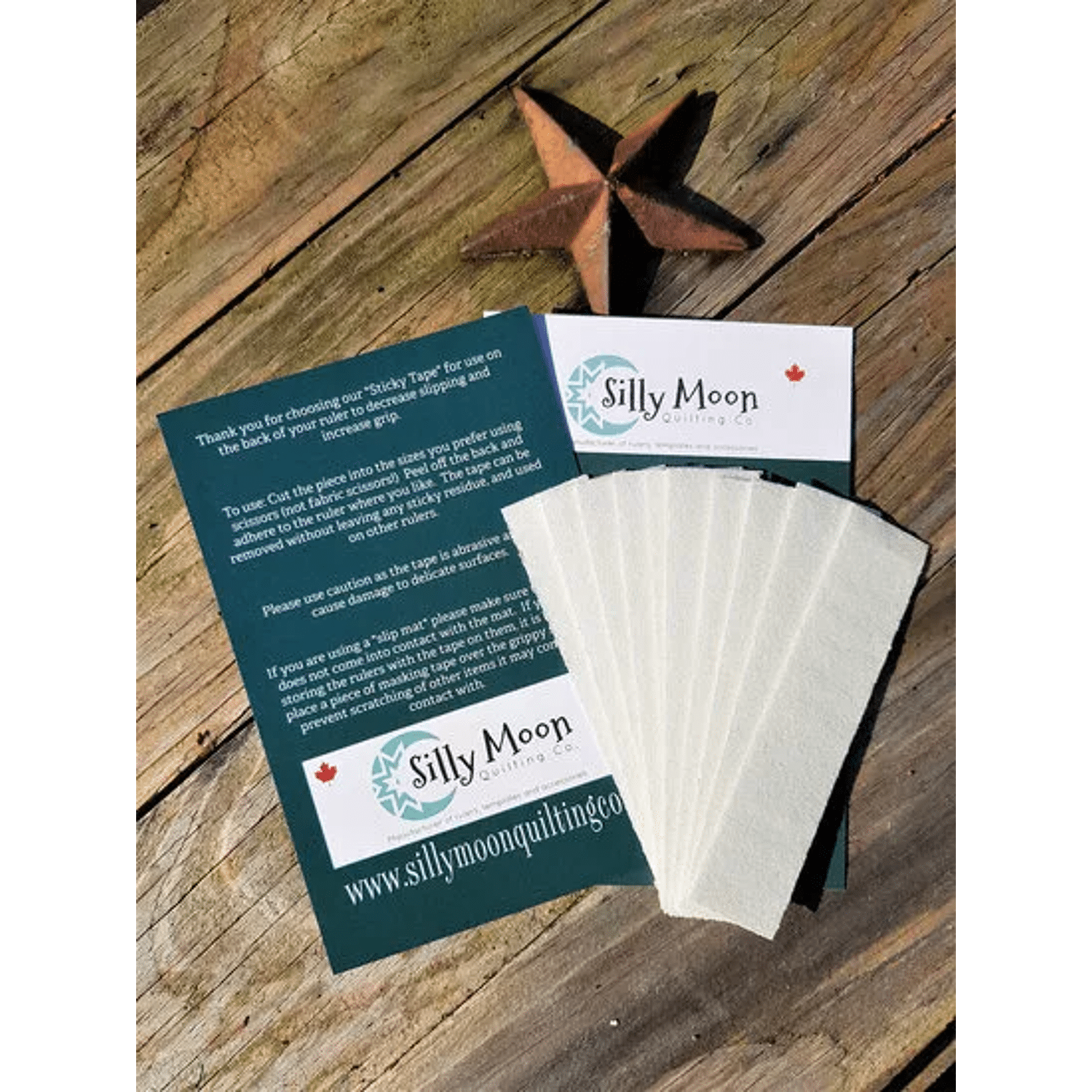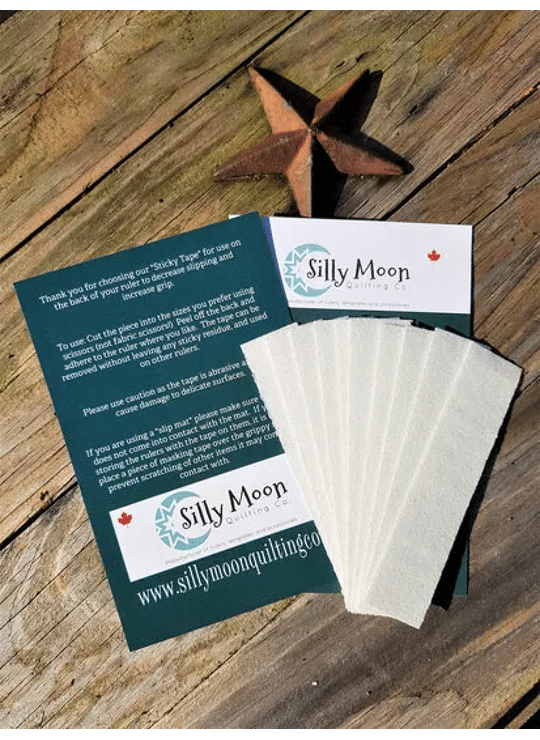 Deze set bevat 10 strips antisliptape van 1" × 4,5" (2,54 × 11,43 cm) voor extra grip op linialen. De tape voorkomt verschuiven tijdens het werken en is vooral handig bij het gebruik van linialen op de naaimachine. Het betreft dezelfde tape die standaard wordt meegeleverd bij linialen van Silly Moon Quilting.