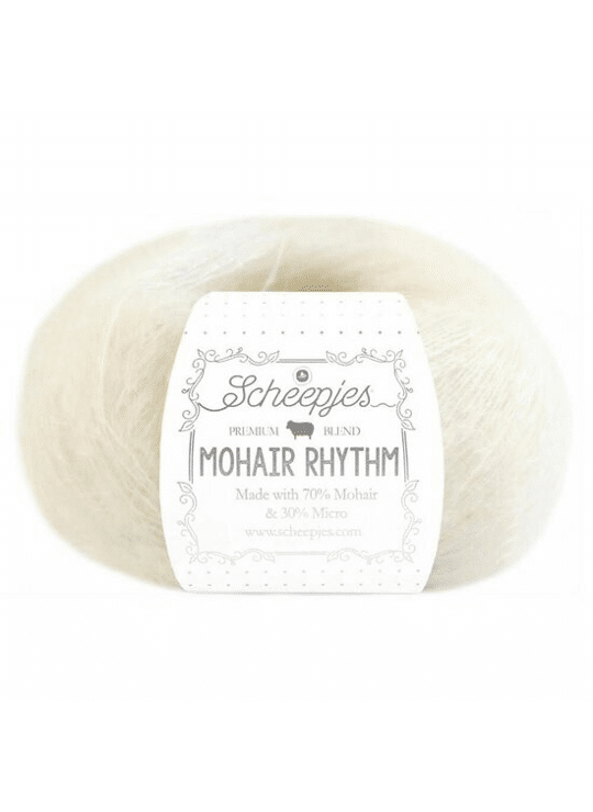 Scheepjes Mohair Rhythm is een prachtig garen van 70% mohair en 30% microvezel. Die mix resulteert in een mooie maar subtiele zijdeglans die uw haak- of breiwerk een bijzonder fraaie afwerking geeft. Ideaal voor het breien of haken van topjes en truien voor het tussenseizoen, maar ook voor fraaie modeaccessoires, zoals sjaals, omslagdoeken of ponchos die lekker licht en luchtig zijn. Scheepjes Mohair Rhythm is een langvezelig garen met een donzige textuur dat heerlijk zacht aanvoelt. Scheepjes Mohair Rhythm is verkrijgbaar in een uitgebreid palet sprekende kleuren die onderling uitstekend zijn te combineren. De combinatie met Scheepjes Alpaca Rhythm levert bovendien interessante textuurcontrasten op. Een bol Scheepjes Mohair Rhythm weegt 25 gram en heeft een looplengte van 200 meter (garendikte Fingering). De aanbevolen naalddikte is 2.00mm.