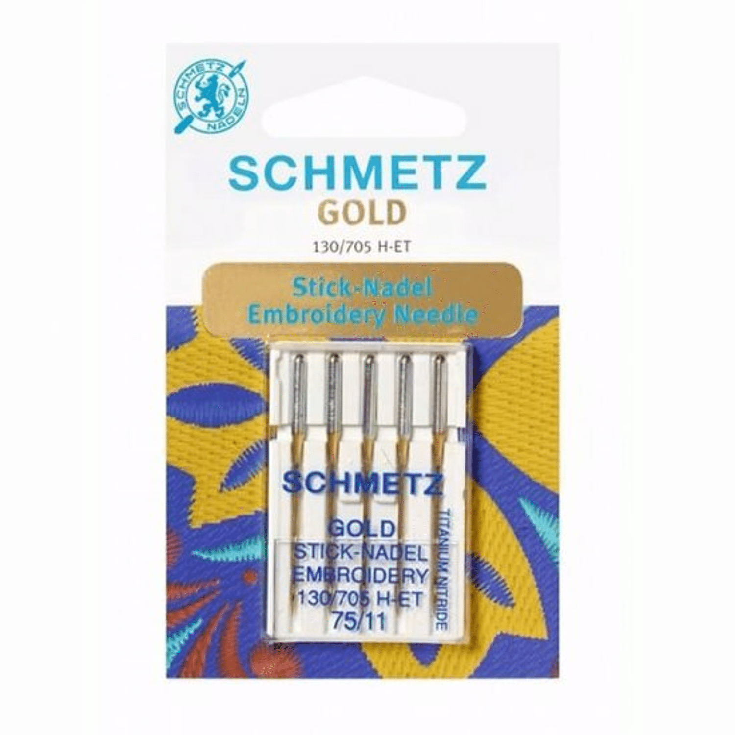 De Schmetz Gold borduurnaald heeft een kleine kogelpunt en, in vergelijking met de universele naald, een extra breed oog. Hierdoor is deze naald ook geschikt voor dikkere garens zoals borduurwol. De naald het een titaniumnitridecoating, wat de naald ook bij een hoog aantal steken verduurzaamt. Het kan worden gebruikt voor machinaal borduren en naaien van solide, strak geweven materialen. De naalden zijn geschikt voor huishoudelijke naaimachines.