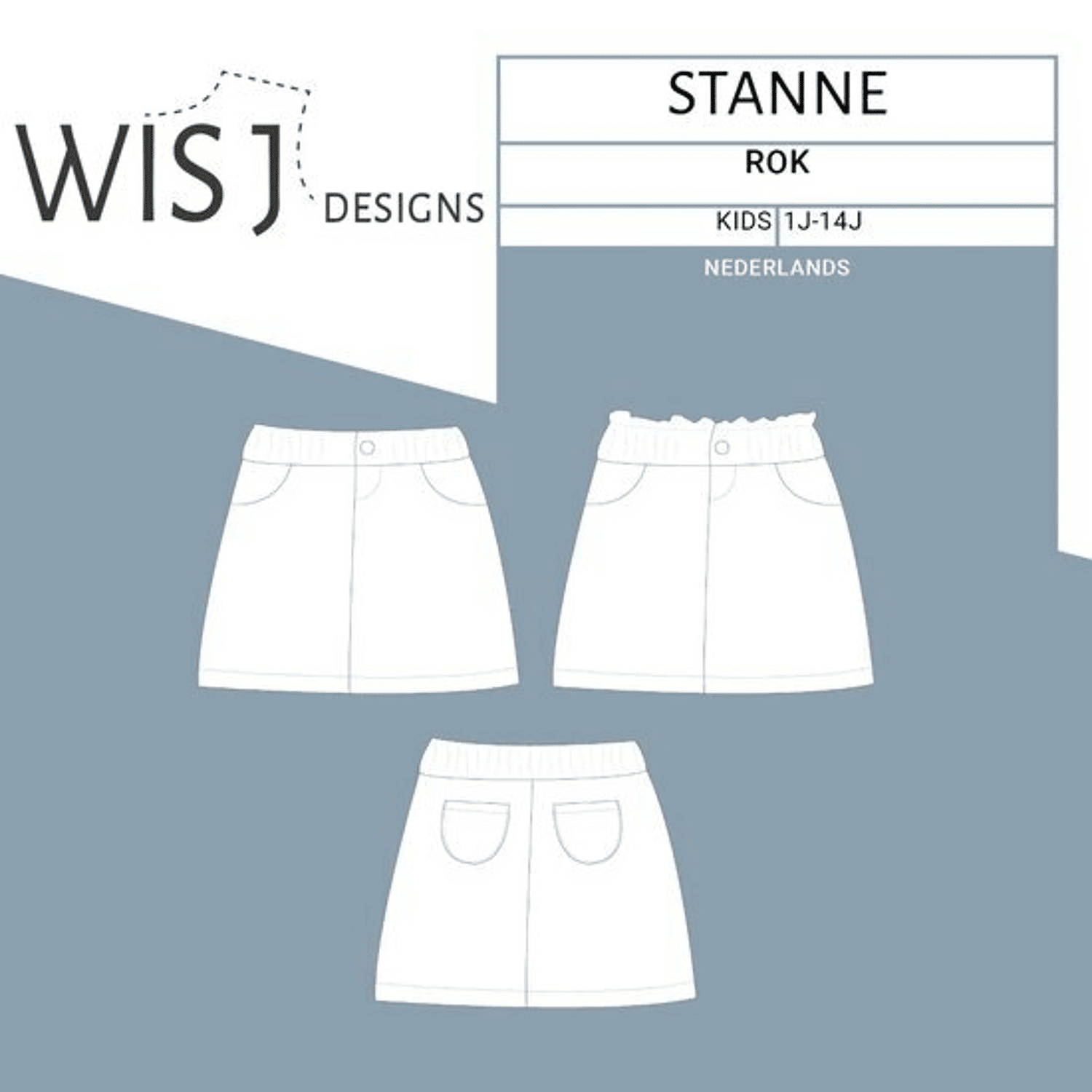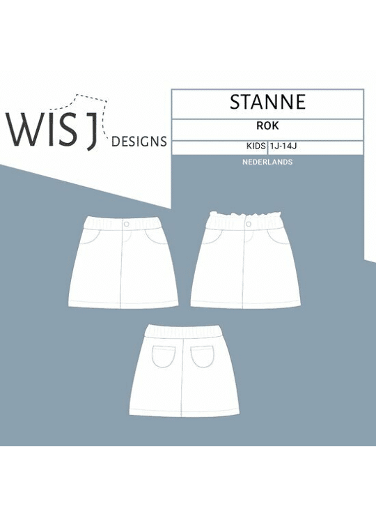 Stanne is een patroon voor een vrolijk kort rokje in maten 1 tot 14 jaar. Stanne heeft een gulp zonder rits, enkel met een (of twee) knoopje(s). Het patroon voorziet zakken vooraan en achteraan, maar voor een snelle versie kan je deze makkelijk weglaten. Stanne kan gemaakt worden met een gewone tailleband of met ene paperbag tailleband. Het is een goeie basic in de kinderkleerkast. In de herfst te combineren met kousjes en laarsjes en in de winter met broekkousen eronder. In de zomer natuurlijk vrolijk met sandaaltjes. Denk aan stoffen als corduroy, jeans, zware katoenen stoffen. Maar even goed matcht Stanne met french terry of een wat lichtere viscose.