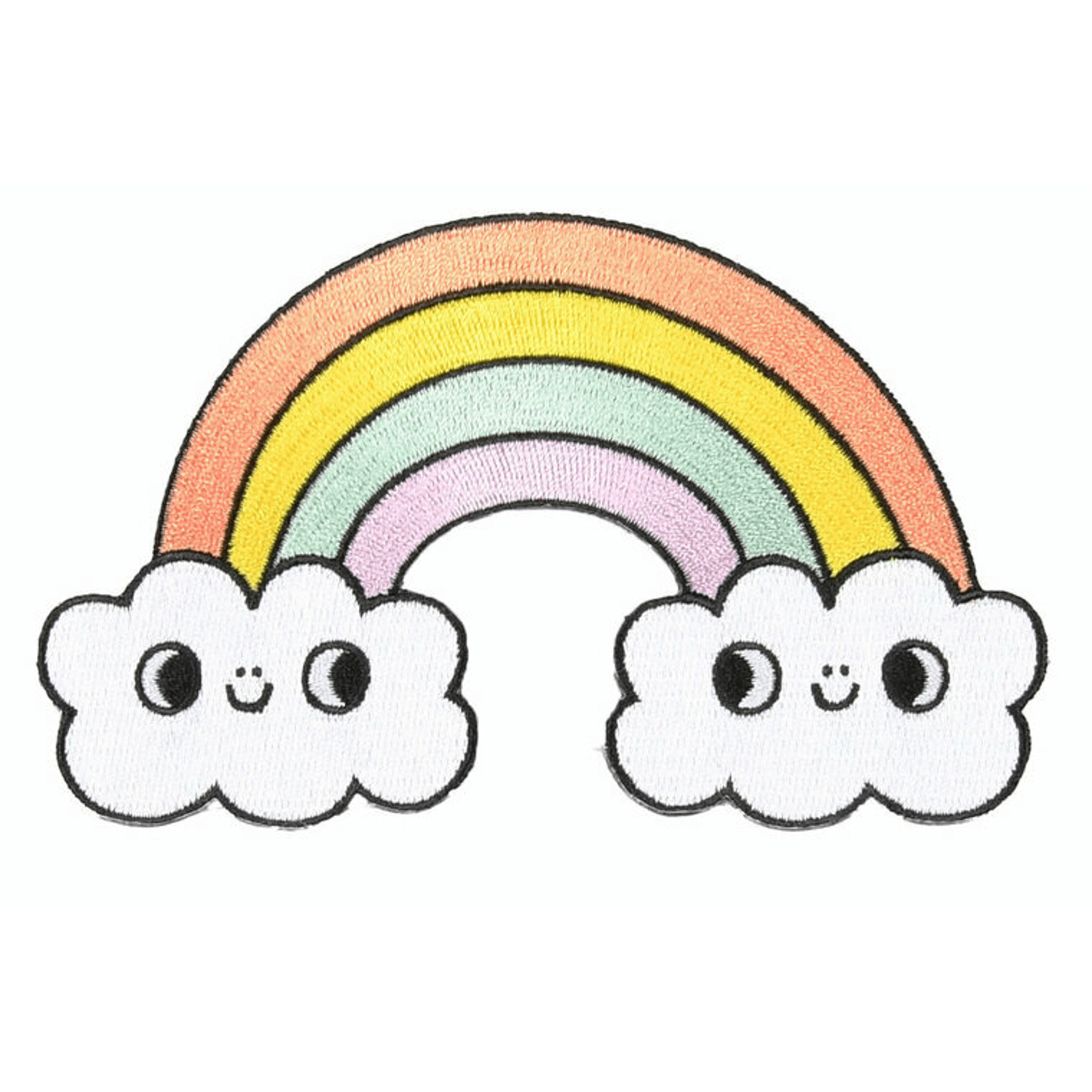 Eva's geborduurde regenboog patch meet ongeveer 13 x 8 cm.