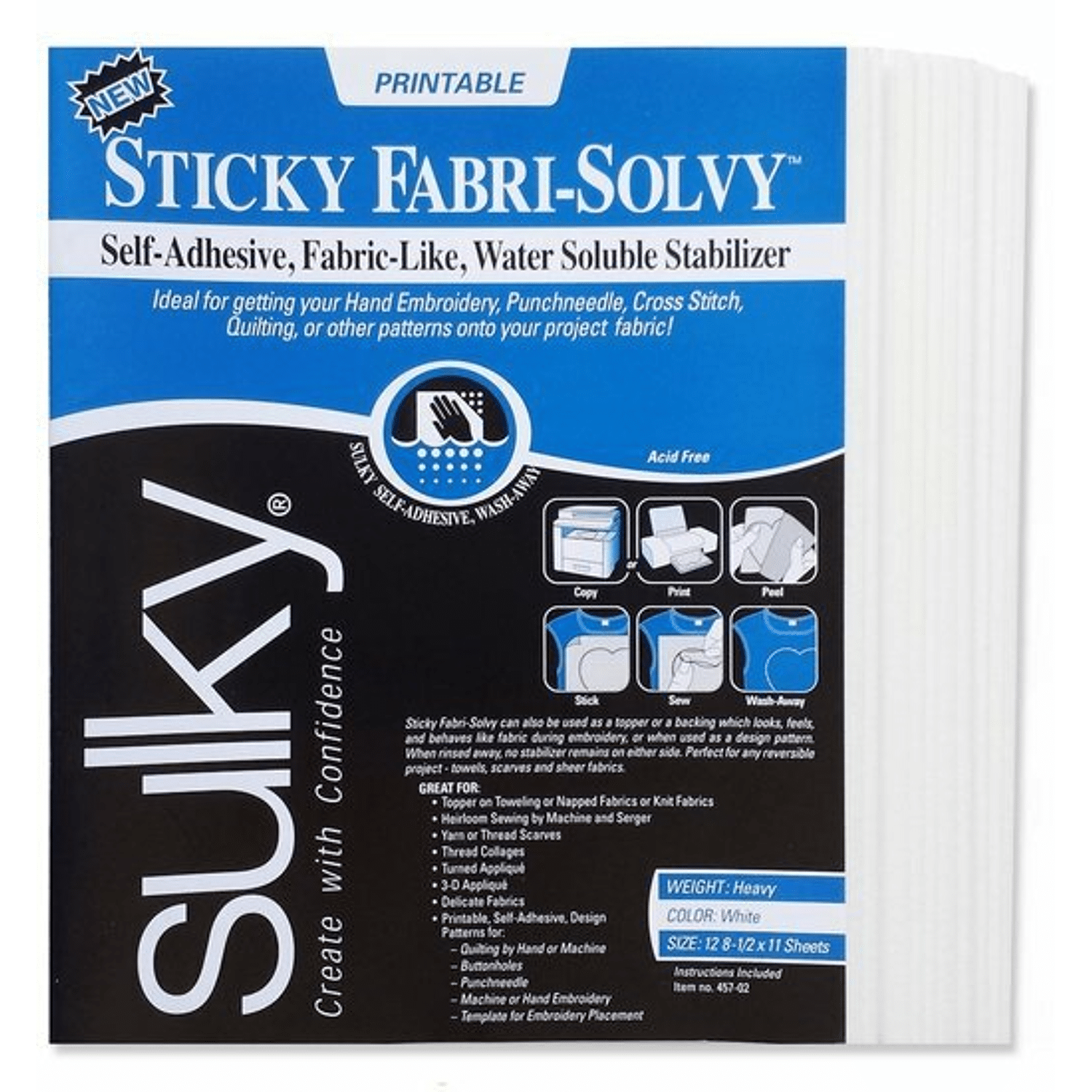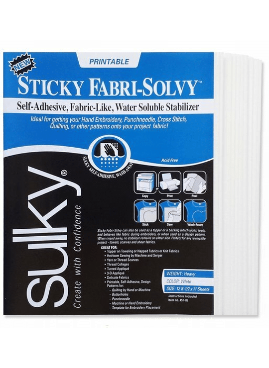 Zelfklevende, stofachtige, in water oplosbare vellen die u door een printer kunt halen of gewoon over uw ontwerp kunt leggen en direct op het vel kunt overtekenen. Nadat het ontwerp is afgedrukt, verwijdert u de papieren achterkant en naait u deze direct op de stof en borduurt u deze. Was na afloop de Fabri-Solvy weg. Het pakket bevat 12 vellen A4-formaat.