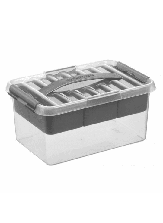 De Q-line 6 liter Multi Opbergbox van Sunware is een praktische en multifunctionele alleskunner! Deze opbergers worden allen standaard geleverd met handige inzet met vakverdeling. Hierdoor kun je kleinere spullen & accessoires opbergen met je bijbehorende grotere voorwerpen. Zo houd je setjes en spullen bestaande uit meerdere onderdelen netjes bij elkaar. Deze 6 liter box is vooral geschikt voor het bewaren van bijvoorbeeld grotere knutsel- & hobbyspullen, speelgoed, naaispullen en ga zo maar door. Zelfs je Doe-Het-Zelf spullen zitten goed opgeborden in deze Multibox. De box is uitgerust met handige sluitclips zodat het deksel goed op zijn plaats blijft. Daarnaast zit er in het deksel een stevige handgreep voor extra draagcomfort. Ook is hij handig te stapelen in combinatie met andere formaten Q-line boxen. De box is transparant zodat je in één oogopslag kunt zien wat erin zit.
